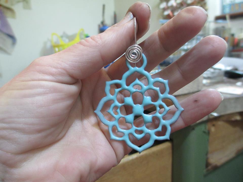 An artist friend of mine, Karen Guthrie (Karen Olwen Designs) hand-crafted these amazing earrings. She had sawn out the copper pieces and then applied seven coats of enamel, then added the earring wires.