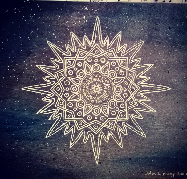 Here’s a cool mandala by John L. Nagy posted on Instagram (@jlnart) which he entitled “Space Mandala”, using acrylic paint, spray paint, gel pen on wood, 8″x 9.5″ (posted 11/24/2014).