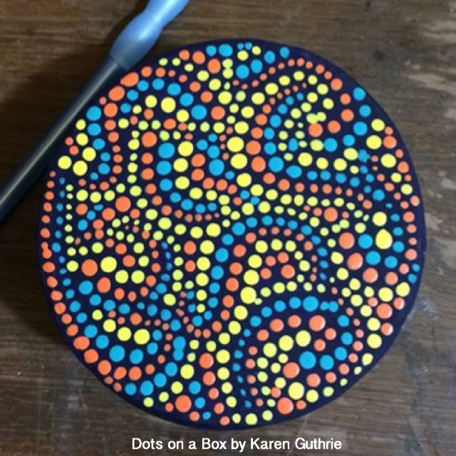 Here she’s decided to play with painting dots (stippling) on a round box. Love the bright colors and the flow of the primary colors creating an asymmetrical mandala. DeLightful!