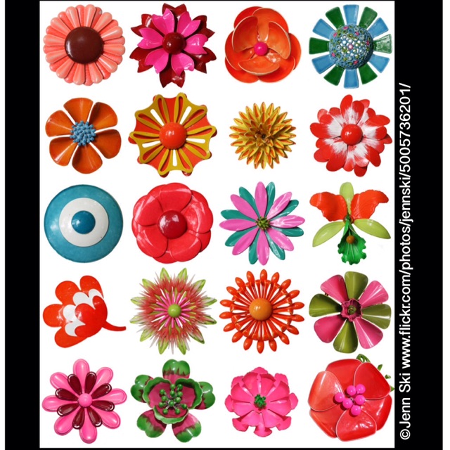 How cool are these! What a fun set of vintage enameled brooches…owned and photographed by artist and illustrator, Jenn Ski, as posted on her flickr page.