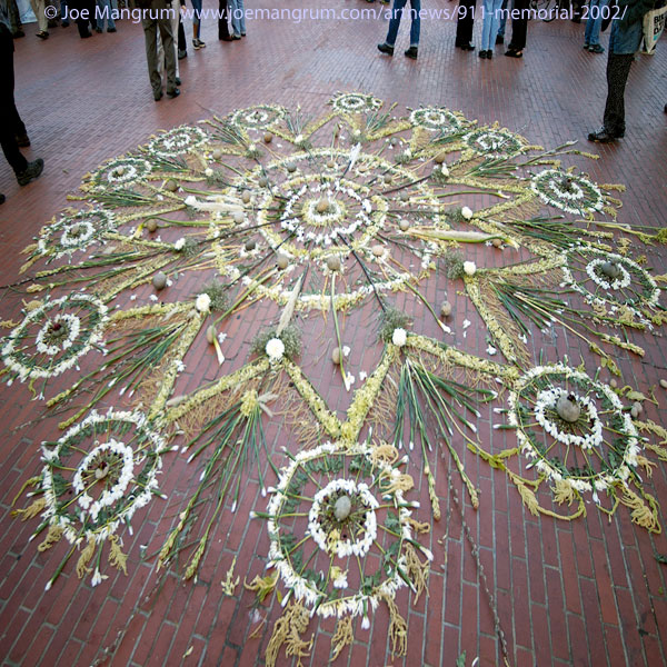 What a beautiful 9/11 Memorial by Joe Mangrum from 2002 using flowers and river stones at Justin Herman Plaza in San Francisco.