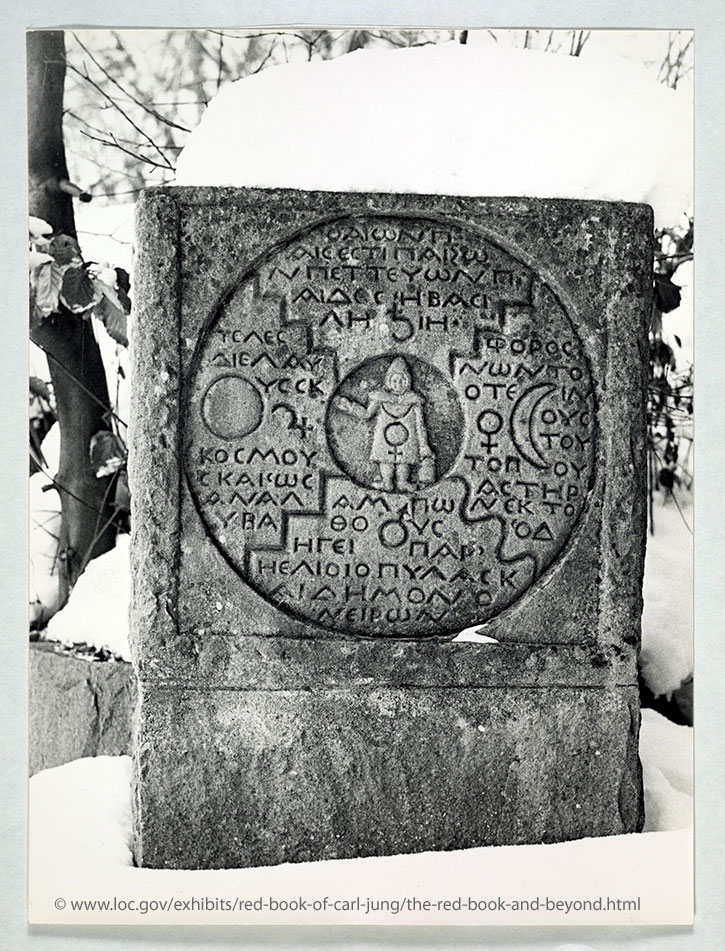 In 1950, on the occasion of his 75th birthday, noted psychiatrist and psychotherapist, Carl Jung, carved this stone cube and set in on the Lake Zurich shore of his retreat home, Bollingen Tower, inscribing it on three sides. On the side shown in this photograph, Jung created this fascinating and powerful mandala centered on Telesphorus, the Greek demi-god of healing, surrounded by a Greek inscription, which states,
