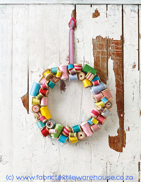 I found this cute wreath project on the Fabric Textile Warehouse web site. What a fun way to make use of old, neglected spools of thread…come on, you know you have a shoe box full of varying lengths of thread laying around the house somewhere.