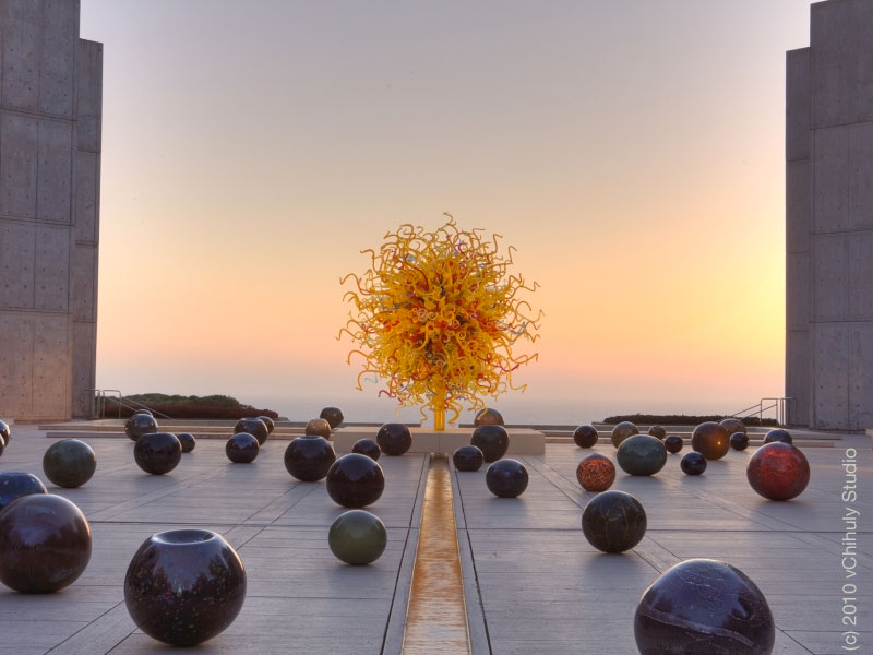 Chihuly’s “The Sun” during the day at Chihuly Glass and Garden Exhibit in SeattleThe Sun and Black Niijima Floats, 2010, Salk Institute for Biological Studies, La Jolla, California