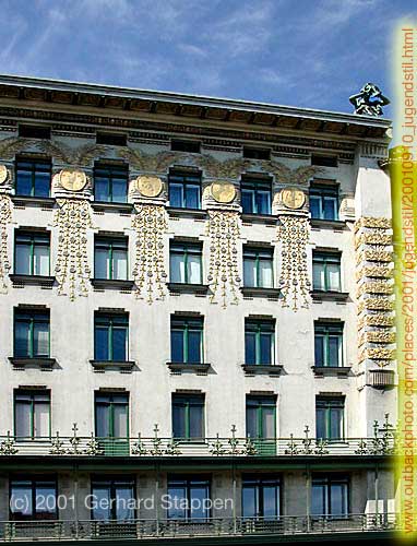 Austrian graphic designer and artist, Koloman Moser, designed these stunning golden medallions (and related designs) that adorn Otto Wagner‘s jugendstil apartment building (1898-99) in Vienna, Austria. It’s beautifully photographed here by nikon80cat.