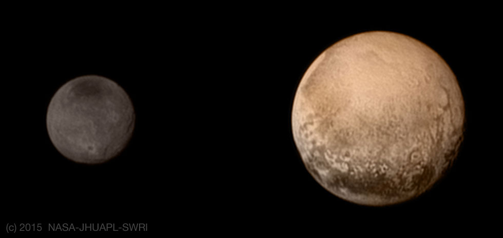 Here’s another side of Pluto with its largest moon, Charon. Notice the top of the heart just coming into view on the left side. Also note how big Charon is in comparison to Pluto. Can you imagine what it would be like if our moon was that big compared to Earth? The full moons would be AWESOME!