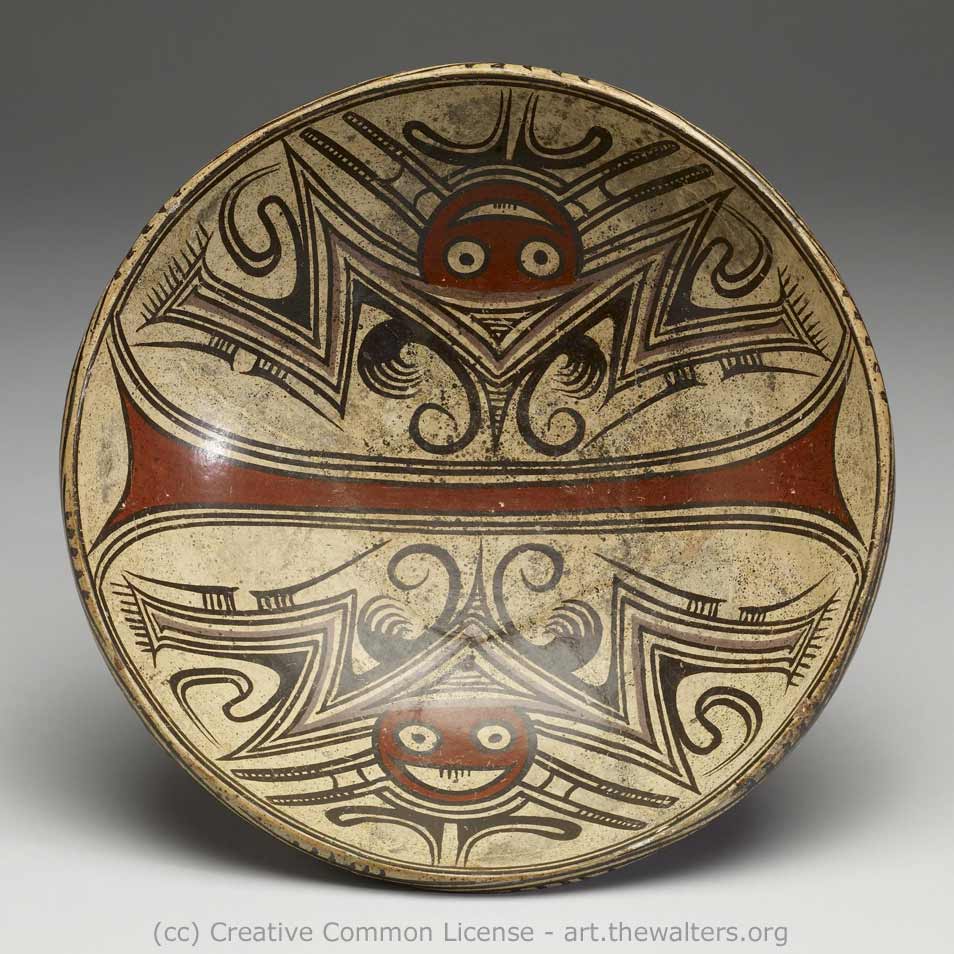 What a provocative piece of ancient earthenware from Gran Coclé in Panama. I love how instead of having the symmetry go around the circle, the symmetry is a mirror: top and bottom, and within each half, the mirror symmetry continues with the winged being.
