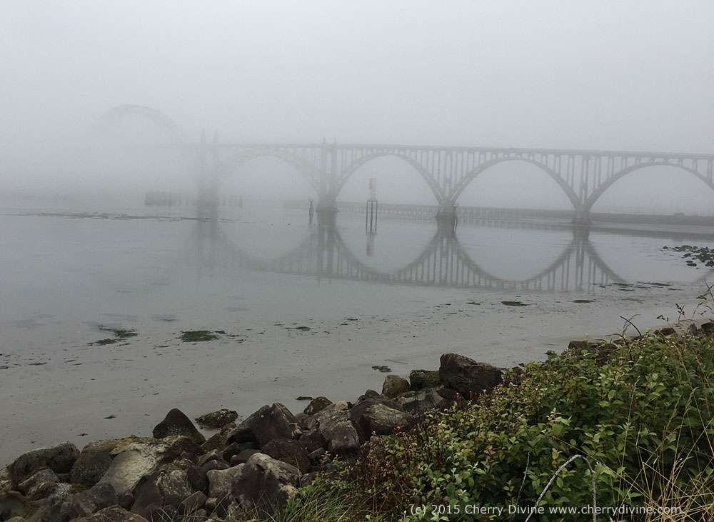 Early Monday morning we took a mystical (foggy) walk down the South Jetty of Yaquina Bay at very low tide. Cherry captured this beautiful photo of the arches of the Yaquina Bay Bridge reflecting into the shallow water creating the illusion of a row of mandalas.