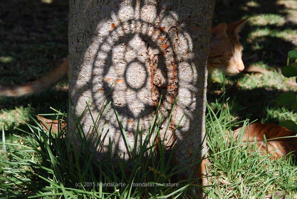 Mandalma of “Mandal’arte ~ mandalas na natureza” on facebook, recently posted this reverse shadow of a mandala onto a tree. What a cool idea! And the cat is a delightful added touch to the scene.