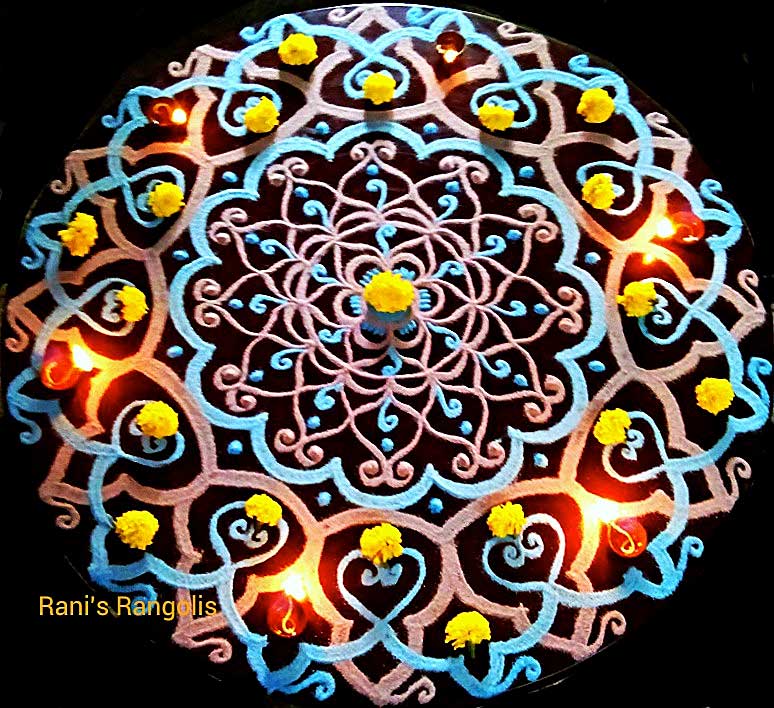 A rangoli signifies a creative expression of art by means of colors. Traditionally women in India create rangolis on the floor, entrances to homes, or on the ground.