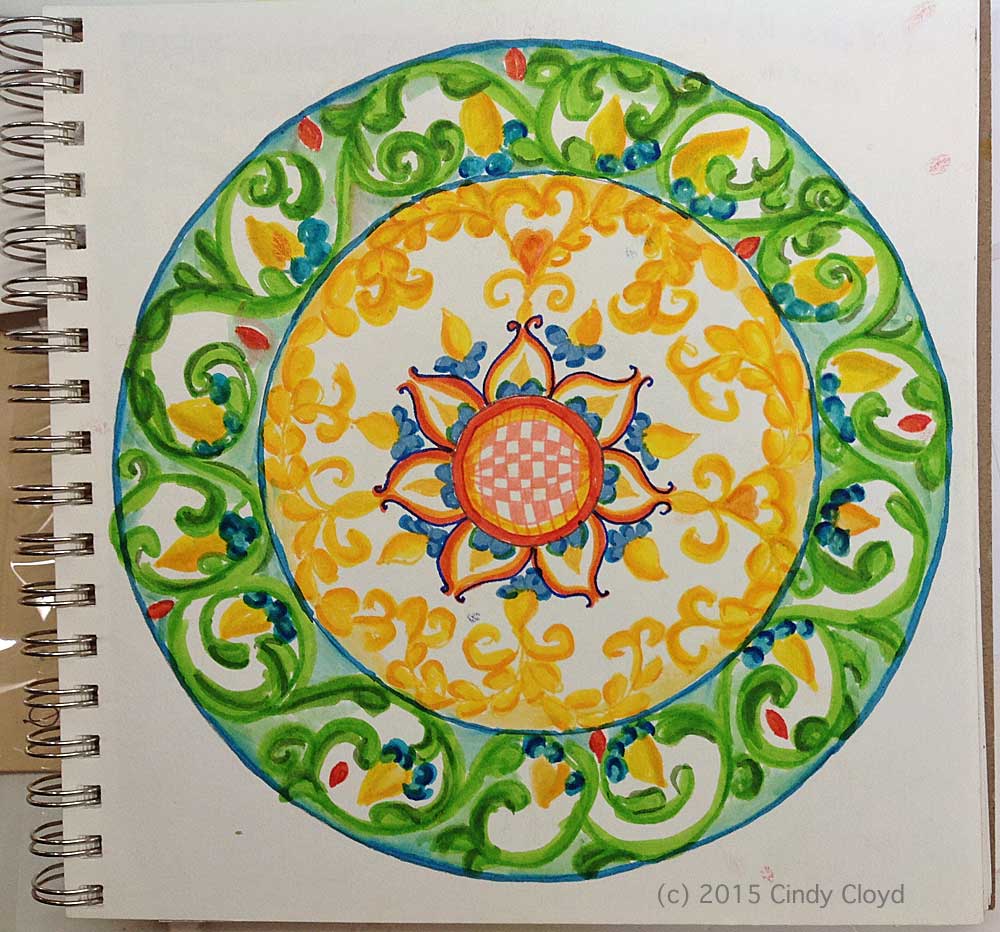 A wonderful customer of mine, Cindy Cloyd, painted this beautiful mandala in her art journal. I love her mixed use of symmetry and asymmetry and the beautiful flow of the design and colors. I also appreciate her free-form style with very little use of outline.