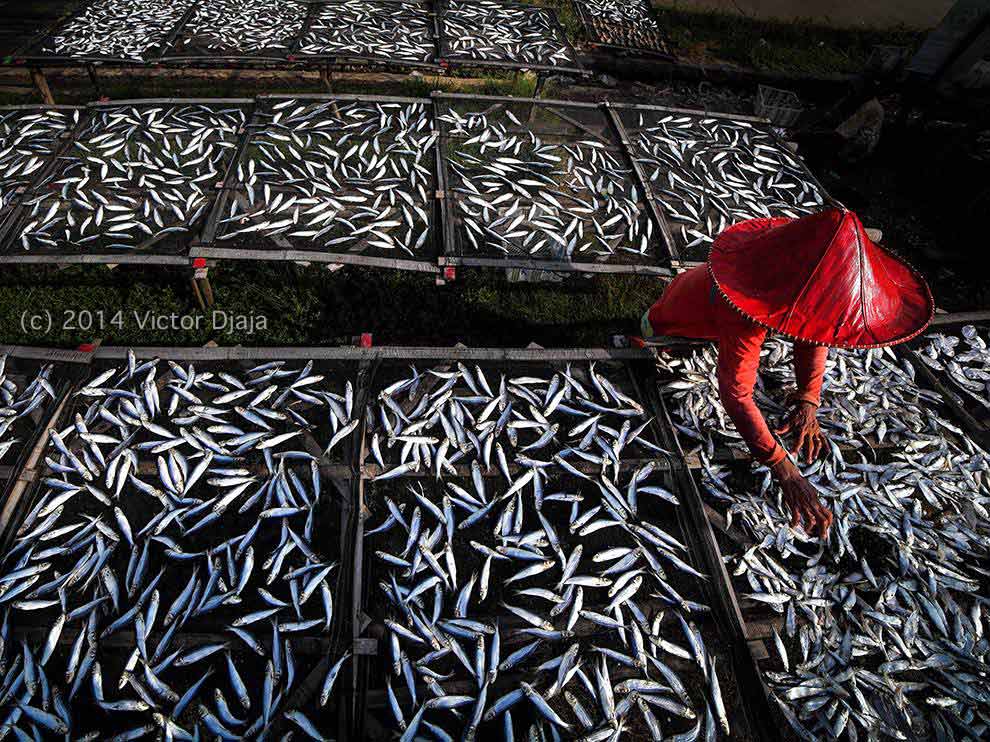 Now this is a beautiful red hat! Indonesian photographer, Victor Djaja, captured this stunning photograph by placing his camera as high above his head as he could while this woman arranged the fish to dry before selling them to traders.