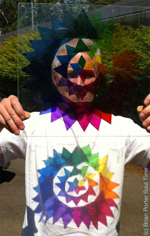 Oregon artist and energy healer, Brian Porter, created this beautiful geometric art piece called Global Earth Star as part of a series called Soul Time Stars. This one consists of three concentric 24 pointed stars (14″ diameter) with copper foil tape on plexiglass. When placed in a window, during the daytime, the color comes into the space and at night, if there is a light on in the room, the color goes out into the world.