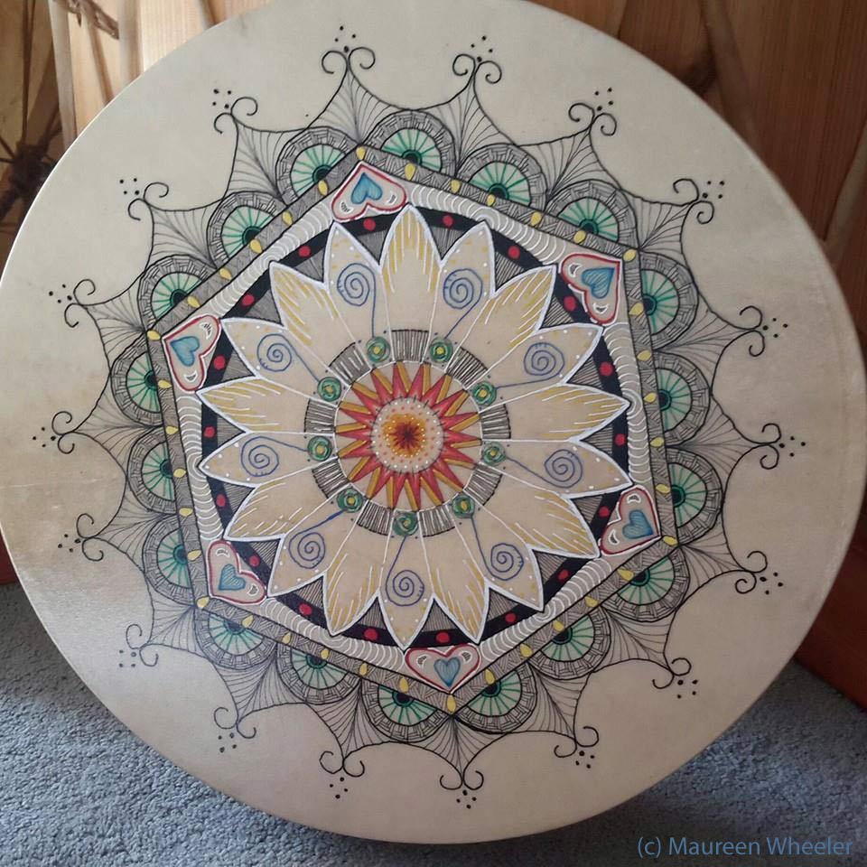 I love this awesome, intricately painted drum by Maureen Wheeler…it looks like it was done with paint pens and/or markers. She incorporated a great mix of colors as well as symbols and lines, angles and curves.