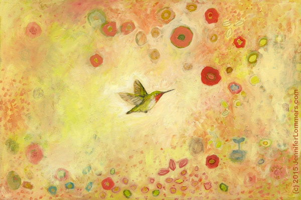 A hummingbird makes his way home through this wistful floral landscape of warm greens and peaches to find his beloved fairyland.