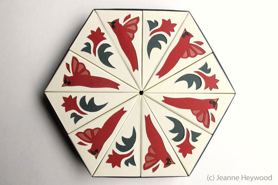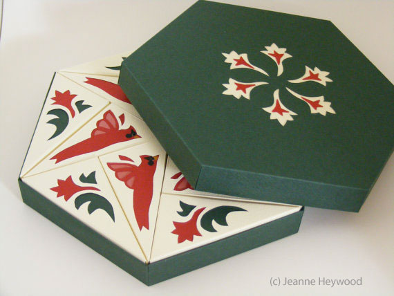 Creating patterns and shapes with paper and experimenting with texture, color and the elements of nature has been a life-long adventure. … I’m inspired by nature and influenced by the centuries old folk art of paper cutting. My work reflects the brilliant color of flowers in bloom and the flight of birds. A combination of a playful activity joined with the process of paper construction, the boxes are both intricate designs and functional, decorative gift boxes.