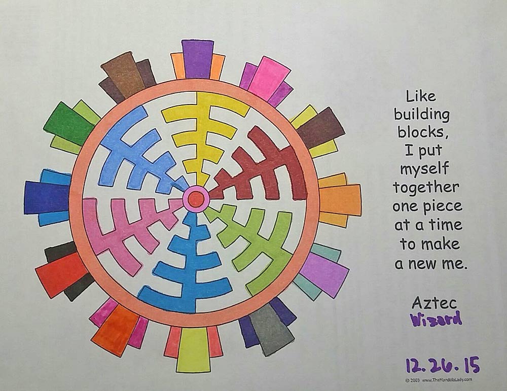 One of my favorite colorers of my mandala designs, Jeffrey St. Rose, turned this symbolic mandala into a delightfully colorful and energized coloring. I love how he left white space within the “Aztec” design…allowing the other colors to stand out more…AND creating two focus points in the center: focus on the white sections or on the color sections.