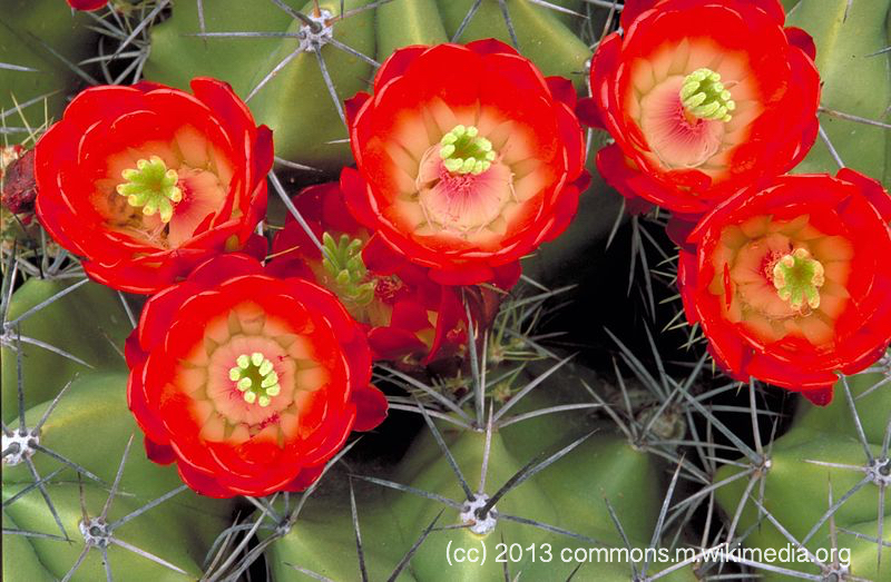 Dr. Thomas G. Barnes, U.S. Fish and Wildlife Service, captured this close-up photo of these beautiful red cactus blossoms. I love how the bright red color of each spectacular mandala-like flower pops against the subdued warm green of the cactus and its gray prickly thorns.