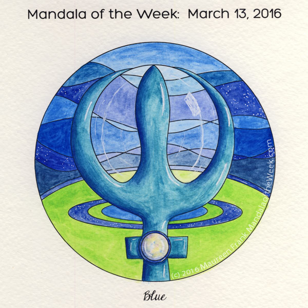 I present my coloring/painting of this week’s Mandala of the Week: Blue (from Sunday’s MotD post). In starting this painting, I only knew that the Neptune glyph held a crystal ball, the rest just evolved as I painted each section. I made a slideshow of my progress through this painting which can be viewed on my ArtProgressions.com blog site.