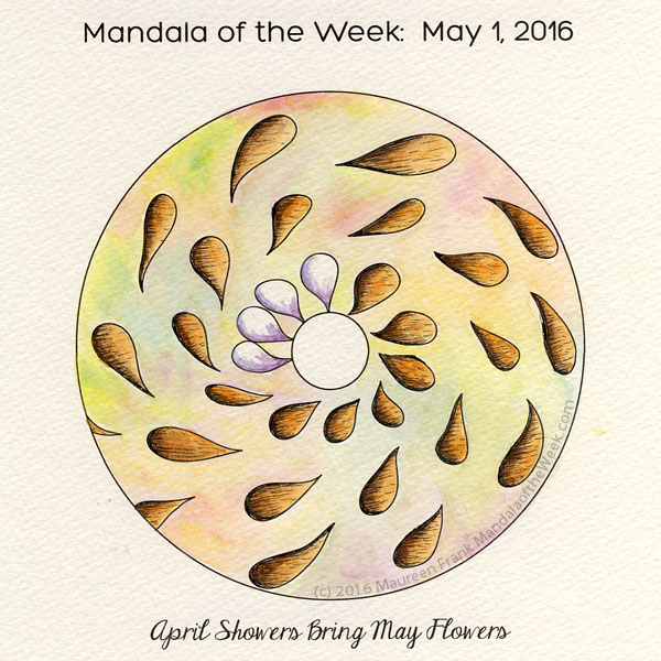 I present my coloring/painting of this week’s Mandala of the Week: April Showers Bring May Flowers (from Sunday’s MotD post). When I thought about painting this mandala, I immediately saw the “rain drops” as pieces of wood that turn into flower petals when they spiral down and attach themselves to the centerpiece. At first I thought about how odd this imagery was, then I do like I always do…I go with it anyway trusting that it will make sense along the way.