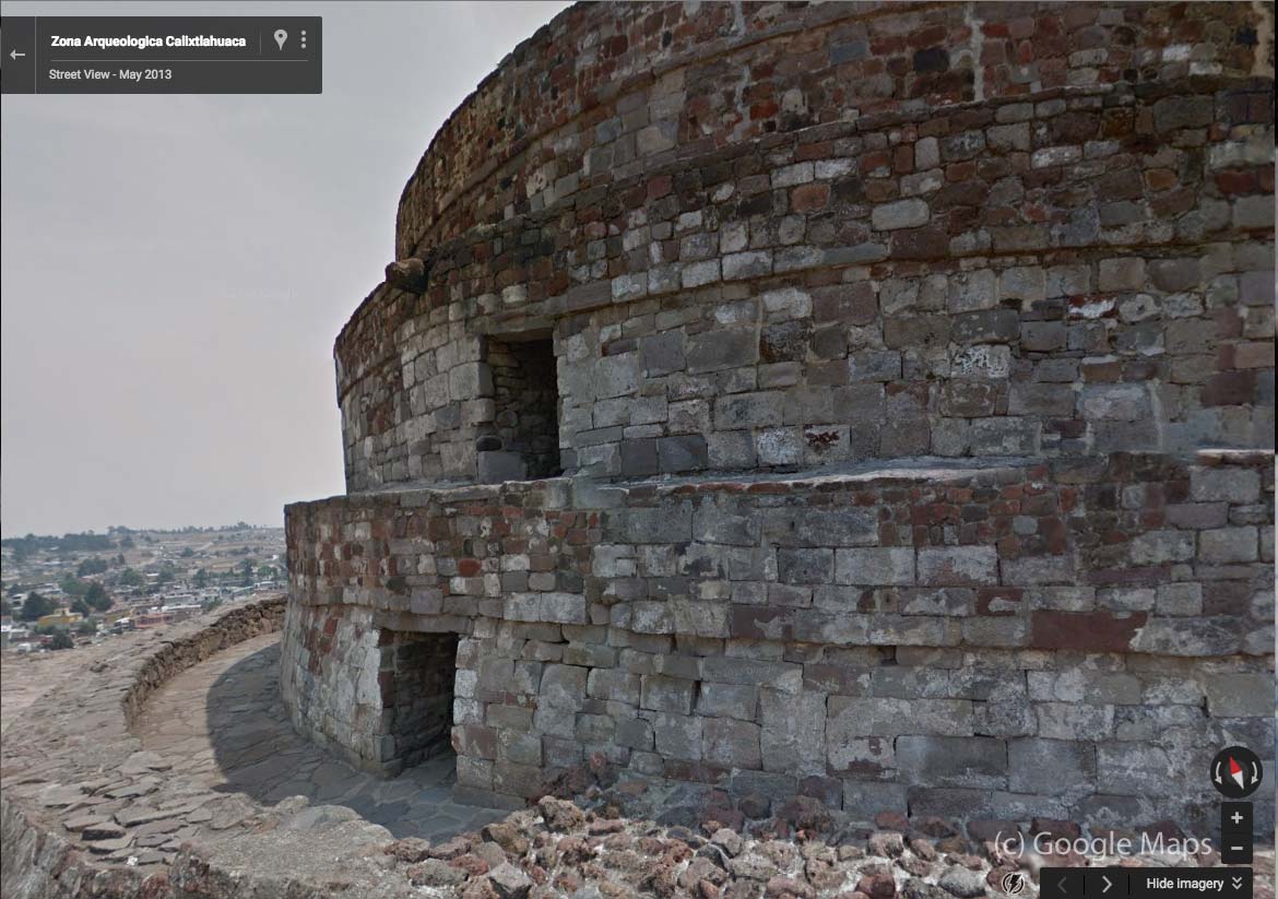 The circular Temple of Quetzalcoatl (God of Wind) can be found in Calixtlahuaca in the Toluca Valley of highland central Mexico. In my quest to view it from overhead, I ended up on google maps and was able to see it up close and personal. Here’s the link to be able to “walk” around it for yourself: Google Maps at Quetzalcoatl. And here’s the link that puts you on top of Quetzalcoatl.