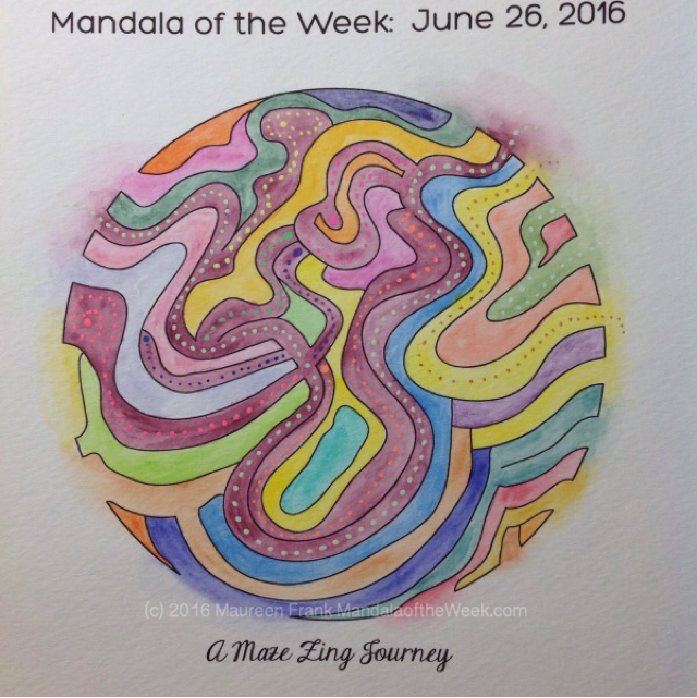 I present my coloring/painting of this week’s Mandala of the Week: A Maze Zing Journey (from Sunday’s MotD post). I randomly chose colors as I proceeded to paint this week’s MotW. By being in color now, it becomes a bit more obvious to locate the inaccessible areas, the dead ends, and the three complete paths that enter and exit (I noted these with dots).