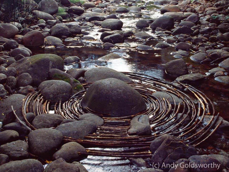 British nature artist, Andy Goldsworthy, known world-wide for his amazing sculptures using things found in nature, put together this stunning piece from curved branches, delicately place over water and rocks, surrounding a large river boulder. My heart skipped a beat when I spotted this art piece. It reminds me of the planet Saturn.