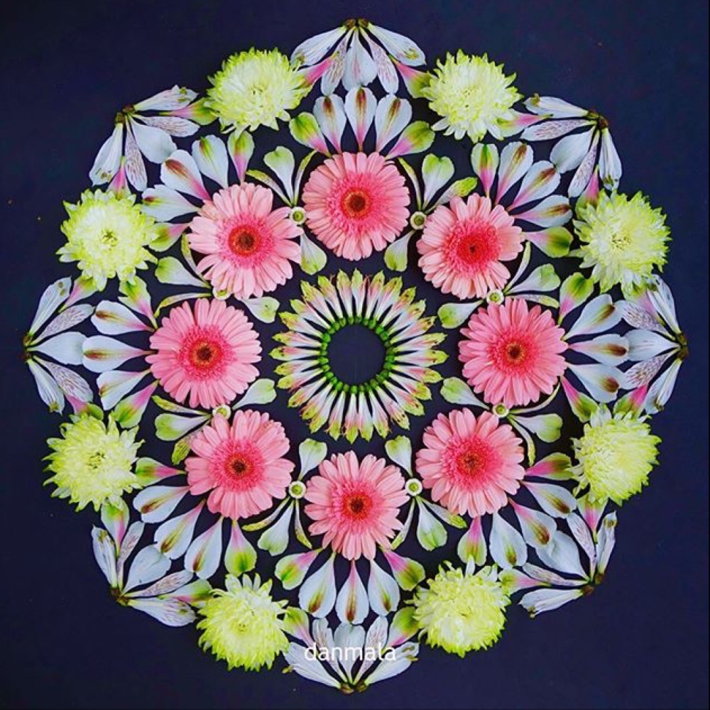 Danmala (“giver of garlands”) artist, Kathy Klein, beautifully put together this vibrant, yet delicate, garland mandala of mixed flowers and petals. About this piece she states that she sang “Let there be peace on earth and let it begin with me” while putting it together. It certainly feels very calming to me.