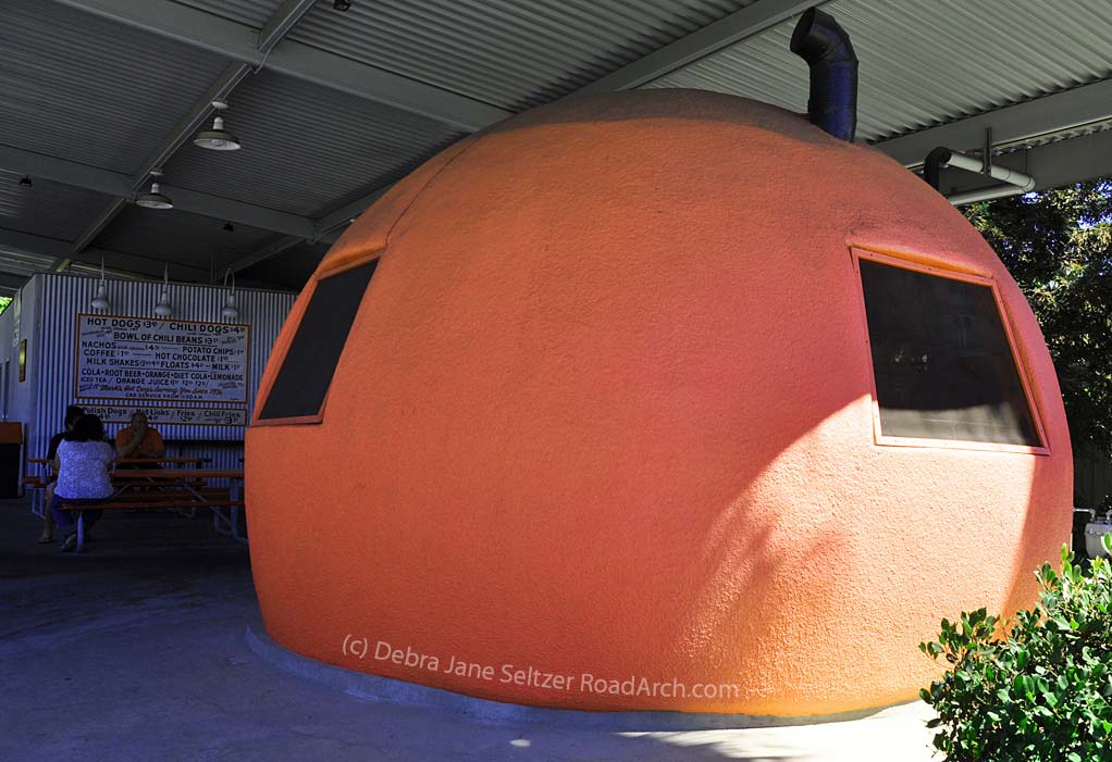 Roadside architecture aficionado, Debra Jane Seltzer, of the Roadside Architecture blog, captured this up-close-and-personal photo of one of the last two remaining orange huts from Frank E. Pohl chain of “Giant Orange” stands. What a cool building! And so orange!