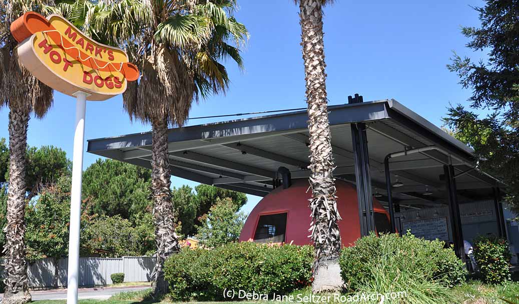 After being declared a historical city landmark the historic building was moved to 48 South Capitol Avenue. Today and since 1947, the orange has been utilized by Mark’s Hot Dogs. Mark’s Hot Dogs originally opened in 1936 and relocated to the orange in 1947. The business was started by Mark Yuram. As far as I can tell the orange was also constructed in 1936, and was placed on the original Alum Rock Avenue site in 1947 when Mark’s Hot Dogs moved into it. It became a city landmark in 1992.
