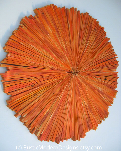 Wisconsin artist, Debra, of Rustic Modern Designs, works with rustic wood to create beautiful works of modern art. Here she put a lot of rustic wood slats together in a circle and painted it orange. I love how she creatively figured out how to reuse strips of wood that otherwise might be useless. And even though she used one shade of color, because of the variations in the wood, it looks like many different shades of orange.