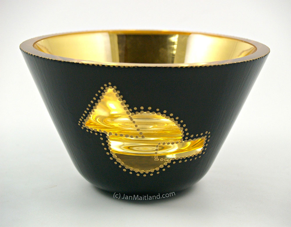 Corvallis artist extraordinaire, Jan Maitland, of Jan Maitland Studio and Gallery, whom I’m thrilled to say I know, creates these exquisitely unique gold-gilded glass bowls to perfection! This one in particular, entitled “Landscape Shapes” caught my eye because of her use of three core shapes (triangle, circle, rectangle), outlined in dots, overlapping each other in her delightful “peek-a-boo” style.