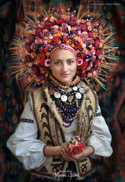 A Slavic team of photographers, stylists, makeup artists and promoters known as “Treti Pivni” (or third rooster in English) gathered together to share with the world the beauty and uniqueness of Ukrainian culture. This particular photo caught my eye for its overall stunning beauty: the young woman, the jewelry, the clothing, the mandala-like flowers, and, of course, the spectacular mandala-like crown.
