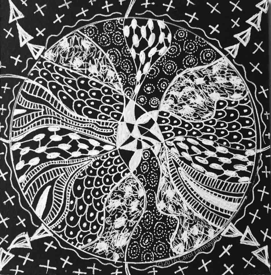 Houston artist, jewelry artist, and maker, Carol Farmayan, hand-drew out this lively white mandala. I love all the different textures and patterns as well as the fluid asymmetrical sections within the circle (mandala). Often times we think we need a variety of colors to make art interesting. Carol shows us a diverse selection of designs that keeps our eye delightfully entertained and mesmerized.