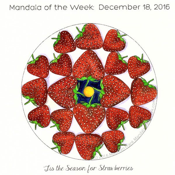 I present my coloring/painting of this week’s Mandala of the Week: Tis the Season for Strawberries (from Sunday’s MotD post). Rarely do I go with reality when painting mandalas however with this one I saw, plain as day, in my mind’s eye that they wanted to be painted in their true form as strawberries. At the same time I also saw (and painted) them as hearts, being the sweethearts that they are.