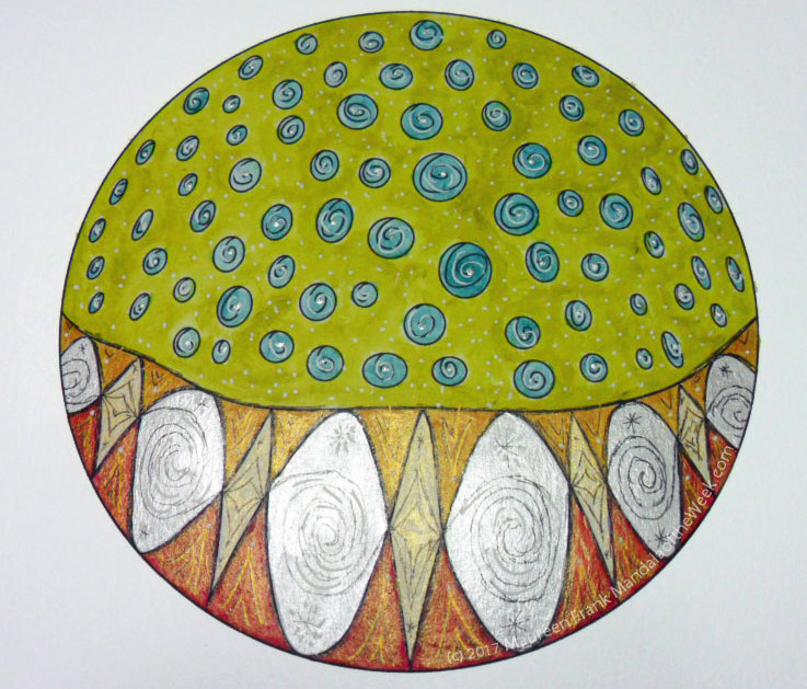 I present my coloring/painting of this week’s Mandala of the Week: Cakes (fromSunday’s MotD post). My doctor last Monday prescribed that I play more…at least once a day. So here it is…the result of me playing today with painting this week’s MotW.