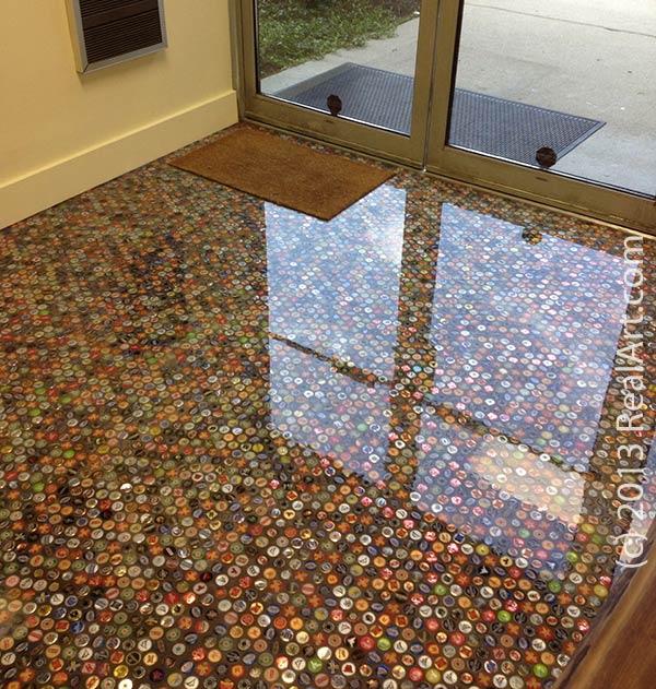 Beer Distributor, Bonbright approached Real Art to redo the entryway at Bonbright HQ. The people at Real Art “saw a chance to not only set them apart but to help them tell the story of their core business: beer.” And that’s what they did. They created a floor covered in round (mandala-like) bottle caps from beers distributed by Bonbright. How clever!