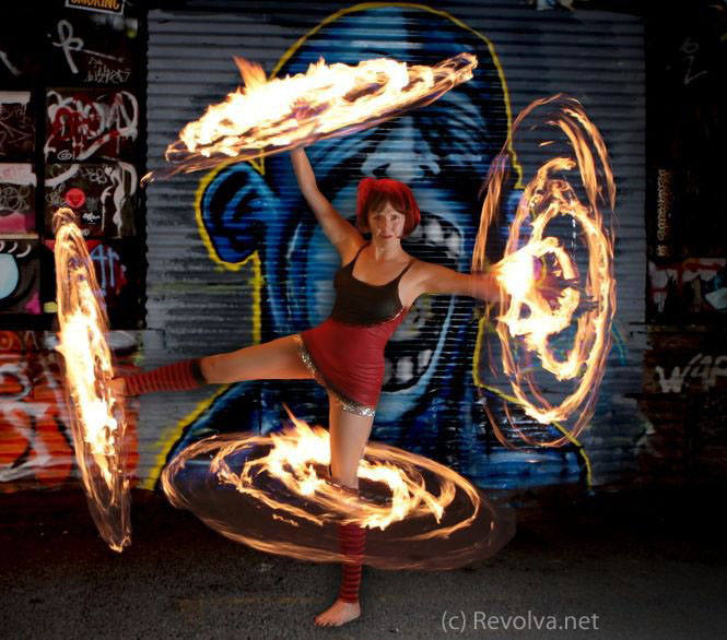 I struggle to make one hula hoop go around my waist, Revolva (an international hula hoop act, circus sensation, writer and character performer) spins FOUR of them…all on FIRE…and all while balancing on ONE LEG! Amazing.
