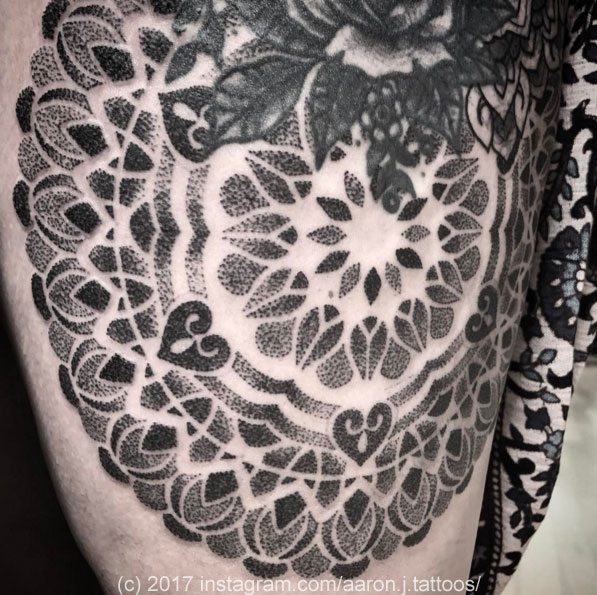 Australian ink artist, Aaron J, added two awesome yet different mandala designs around an already existing rose tattoo (by @genuinehustletattoo). Aaron creates his beautiful ink art with dots (stippling)…lots and lots of dots. Looking up close we can see that rather than ‘drawing lines’, he shapes the dots to imply the lines. Very cool effect!