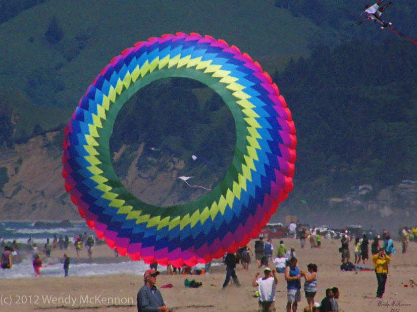 While I was at the Lincoln City Kite Festival in Lincoln City, Oregon, I noticed waaay down the beach this wonderful, colorful round kite flying! So I zoomed in and got this shot. This kite was really big and the wind was very strong that day!!!