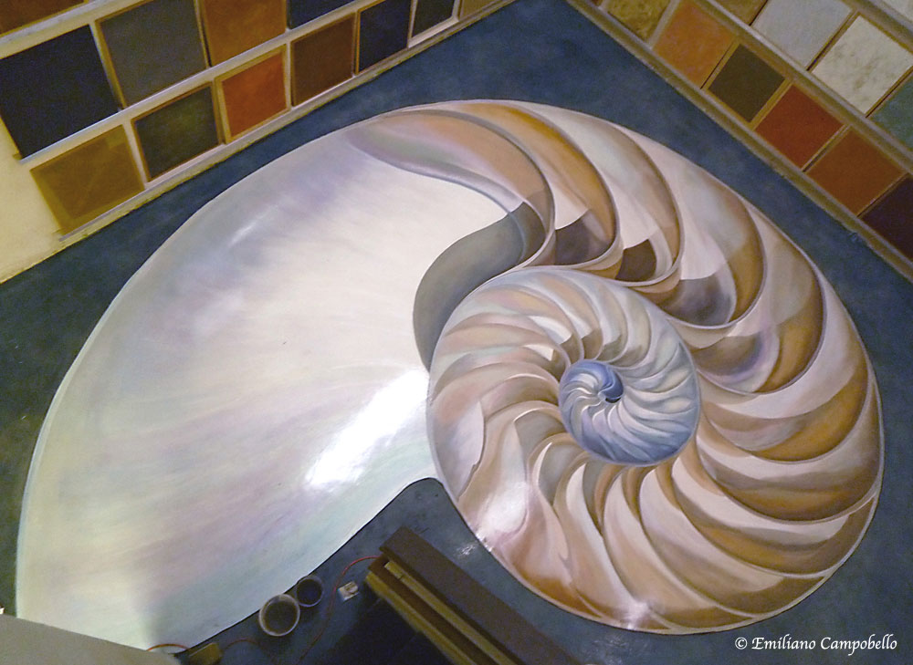 Santa Barbara artist, Emiliano Campobello, painted this stunning trompe l’oeil (fool the eye) nautilus on a design showroom floor. How fun to have the opportunity to paint on a floor. I love how it looks so real. He beautifully demonstrates how shadows give his painting depth and dimensionality.