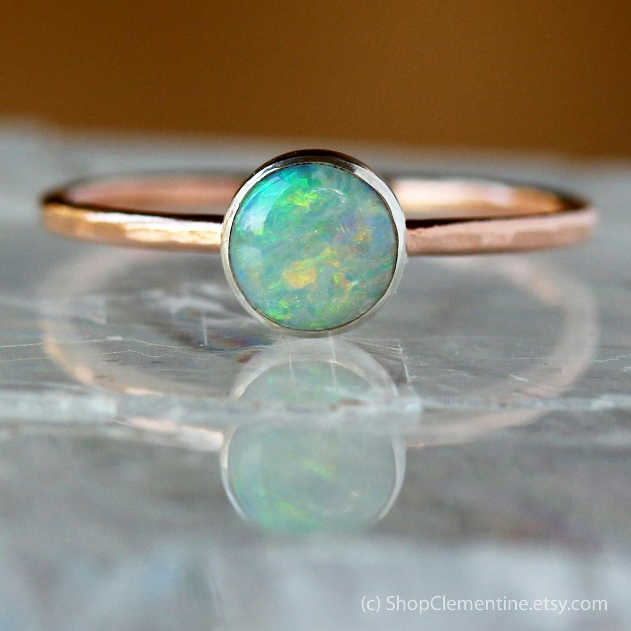 The Opal is a precious stone, expertly cut and measuring 6mm. The 14k gold I use is recycled and refined in the U.S. in an environmental-award-winning plant. … The band measures approximately 1.5mm wide.