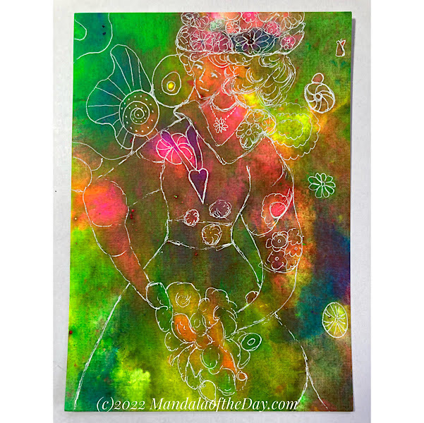 Today’s mandala took an interesting turn. When I pulled out the previously poured paper this morning, I looked at it and then looked at it again…that’s when I saw the woman standing in a mystical fantasy world with a bouquet of flowers, wearing a poofy-sleeved dress, big hair, and a big flowery bonnet. It looked like something from an impressionistic painting. (see the pre-drawn image below)
