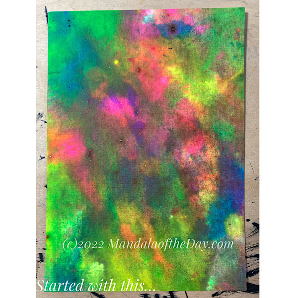 Today’s mandala took an interesting turn. When I pulled out the previously poured paper this morning, I looked at it and then looked at it again…that’s when I saw the woman standing in a mystical fantasy world with a bouquet of flowers, wearing a poofy-sleeved dress, big hair, and a big flowery bonnet. It looked like something from an impressionistic painting. (see the pre-drawn image below)