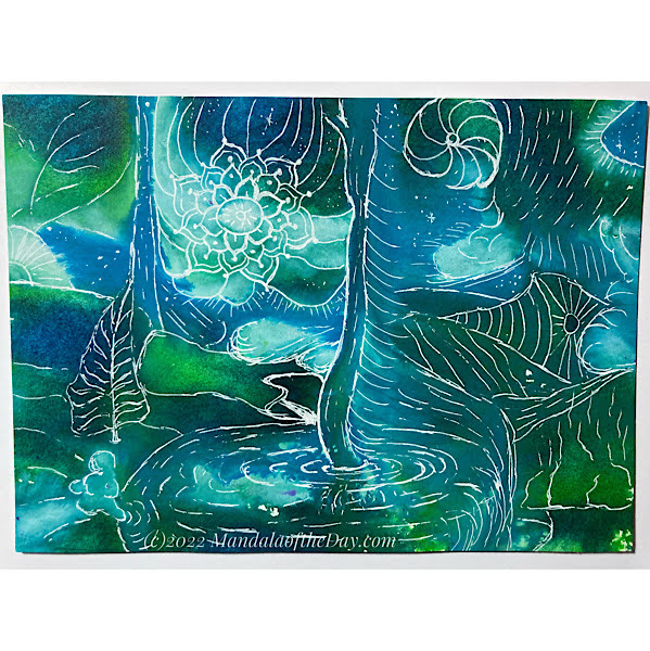 In this dreamscape I see a timid animal (lower left) testing the waters (although it also looks like a person just getting out of the water and walking away), a big fish being still under the water, a tree without branches growing out of that water and its roots under the water. I see a calm pool of water that goes into a small waterfall (lower right), another tree situated on land, hills, and wild things happening in the night sky. The mandala feels like its coming down from the heavens (insights coming?). The nautilus type mandala (upper right) has an opening in its design (letting something in or out?). Overall a lot of energy and movement and yet it gives me a sense of calm, as if to say ”all in due time”. In looking at the fish again, a question comes to mind: would I rather be a big fish in a small pond or a small fish in a big pond (ocean)? Definitely lots to ponder.