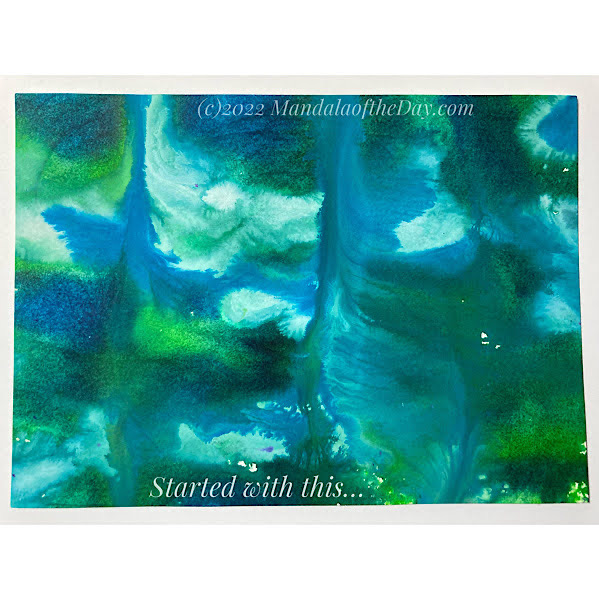 Ok, so this mandala is a little bit different. When I pulled out the pre-painted paper (see below), I saw in it several things: a landscape, a skyscape, a couple of critters, and a couple of trees. I felt inspired to accentuate them and bring them to life. Looking at it now, the whole thing looks so surreal, especially when I was drawing it out…I almost gave up on it thinking it was too weird. Then I heard in my head the word ”dreamscape”.