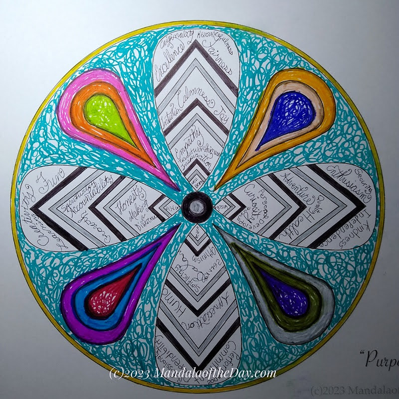 So now what do I do? I’ve already colored this mandala using the “values” intention. I have to trust that my Inner Self wanted me to look at my values first before doing the exercise associated with this principle. My sense tells me to still do Canfield’s exercise AND the “Core Values” exercise. Let’s see how that goes tomorrow.