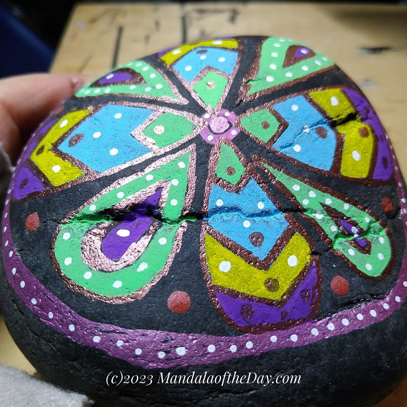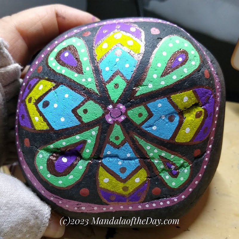 Today I felt inspired to paint this week’s MotW on a bigger-than-what-I-usually-paint-on stone. Thankfully, I’m so used to the design, that it was relatively to draw it out. Then I painted it using posca paint pens. So much fun.