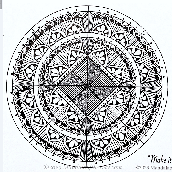 I invite you to color along with me this year as part of what I’m calling “The Year of Self-Exploration and Expansion” with all of my “Mandalas of the ___” (day, week, month, year). If you’re interested in more of a self-exploration approach to coloring, check out my “Coloring Mandalas as Meditation”. You can download this mandala at MandalaoftheWeek.com.