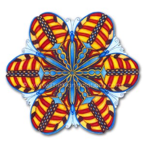 About 20 years ago while walking in my neighborhood I saw a dead butterfly on the ground, completely intact. I picked it up with the intent of creating a mandala for it. About six months later, I was hiking by myself at a popular locale called Bald Hill. As I’m coming around this corner I see a butterfly, and then another one, and then another one until I was surrounded by about 20 of them. It dawned on my that I had yet to create the butterfly mandala I promised I would make. While still walking, I said out loud to this kaleidoscope of butterflies: “Ok. Ok. I’ll make the butterfly mandala.” Ten feet later they were all gone. Somewhat freaked out by this, I said to myself: “Ok. Now I’m REALLY going to make that mandala”. And here she is: